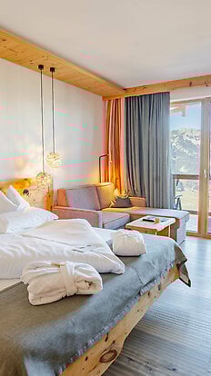 Enjoy the breathtaking 180-degree mountain panorama directly from your room - an endless view that makes the heart of every nature lover beat faster! This room combines trendy Alpine style with the naturalness of untreated Swiss stone pine and old wood, complemented by high-quality fabrics and carefully selected fine materials that create an atmosphere full of warmth and comfort. The bathroom impresses with its robust wooden fittings and elegant washbasin, perfect for revitalising yourself.